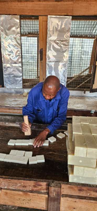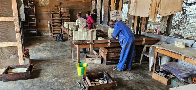 La production de savons est réalisée à partir de noix palmistes fournies par les petits producteurs agricoles locaux et pressées après séchage. Ces savons sont produits dans un atelier propre aménagé pour une disposition optimale des différents postes de travail. La maîtrise de processus de travail définis permet d’assurer une qualité maîtrisée des savons. L’atelier offre une gamme de savons hygiéniques variée qu’elle a le souci permanent d’optimiser, en les parfumant avec des huiles essentielles. Par un processus simple et rigoureux, l’atelier étudie l’extension de sa gamme à des usages divers. Cette activité assure du travail pérenne au personnel de la production, mais également aux producteurs de noix palmistes.
